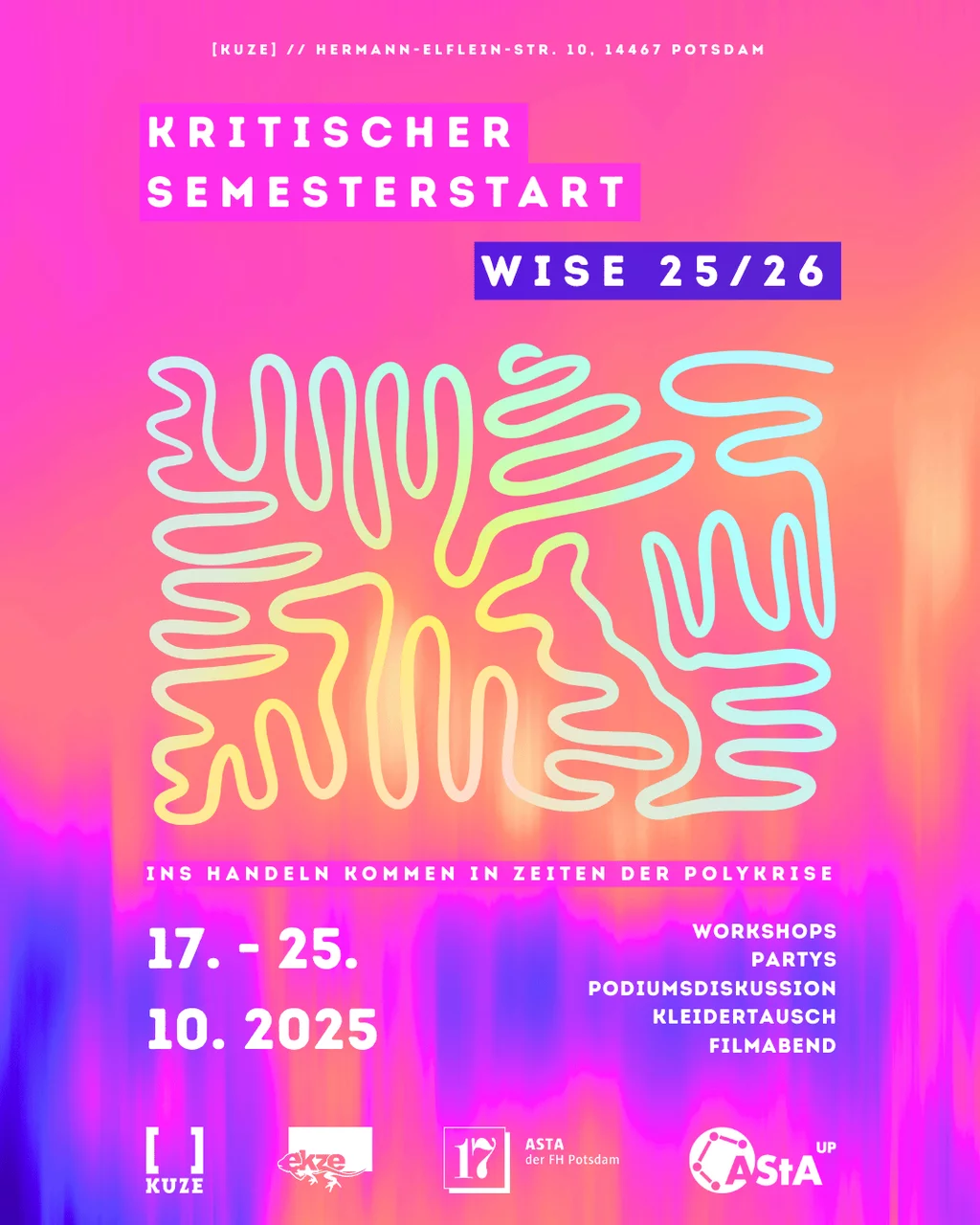 Der Kritische Semesterstart setzt dem etwas entgegen. Mit Vorträgen, Workshops, Filmvorführungen und weiteren Formaten schaffen wir Räume für Austausch, Widerstand und Solidarität. Wir wollen das lähmende Krisenbewusstsein mit kollektiver Handlungsfähigkeit beantworten.